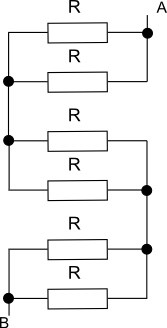 Man får titta på hur sammankopplingarna sitter. Punkten A är kopplad till båda de två översta trådarna som också är ihopkopplade i vänsta ändan, därmed är de parallellkopplade. Dessa kopplas sedan till vänstra ändan på de två mitt-trådarna som är ihopkopplade i höra ändan osv.