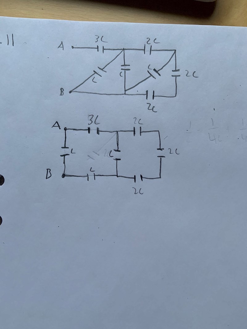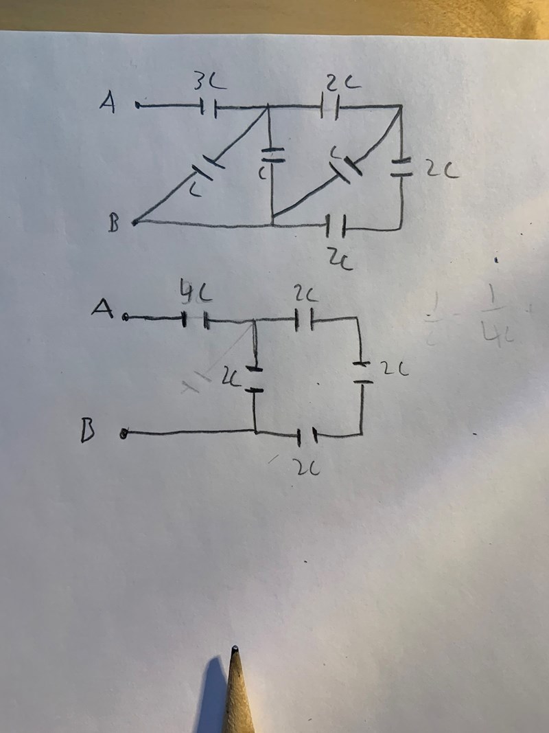 De två i den röda ellipsen på högersida (där du skulle börja enligt uppgiften) är uppenbart seriekopplade. Huvudräkning ger en kapacitans C.