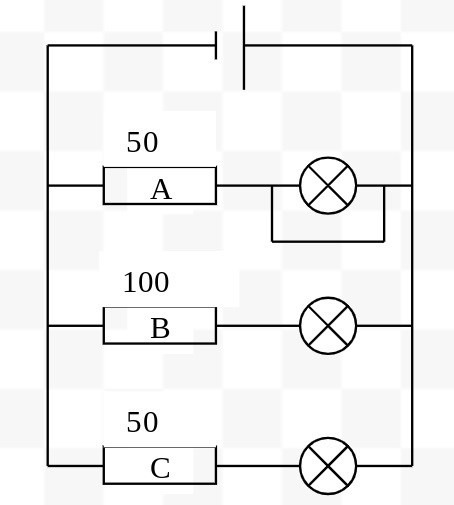 Frågan är "I kopplingsschemat nedan är alla lampor lika. Genom vilket motstånd, A, B eller C, är strömmen starkast? Förklara!"