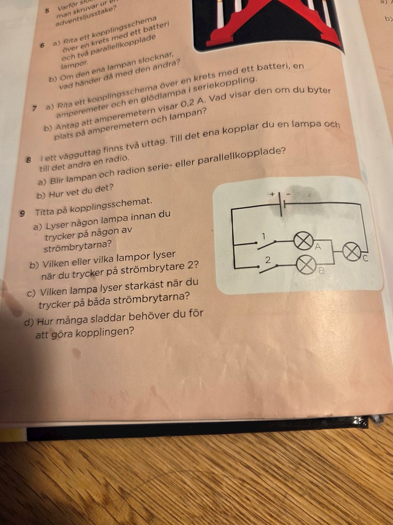 Fråga (d) känns rätt märklig, men sju sladdar är rimligt.