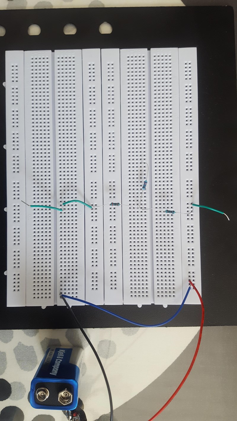 Du skulle tex koppla in de tre resistorerna genom att använda de övre +/- raderna som ingångar och de nedre +/- raderna som utgångar. Och antingen kortsluta eller mäta resistans med multimeter på dessa in/utgångar. Kan du klura ut hur du kan sätta resistorerna för att uppnå detta?