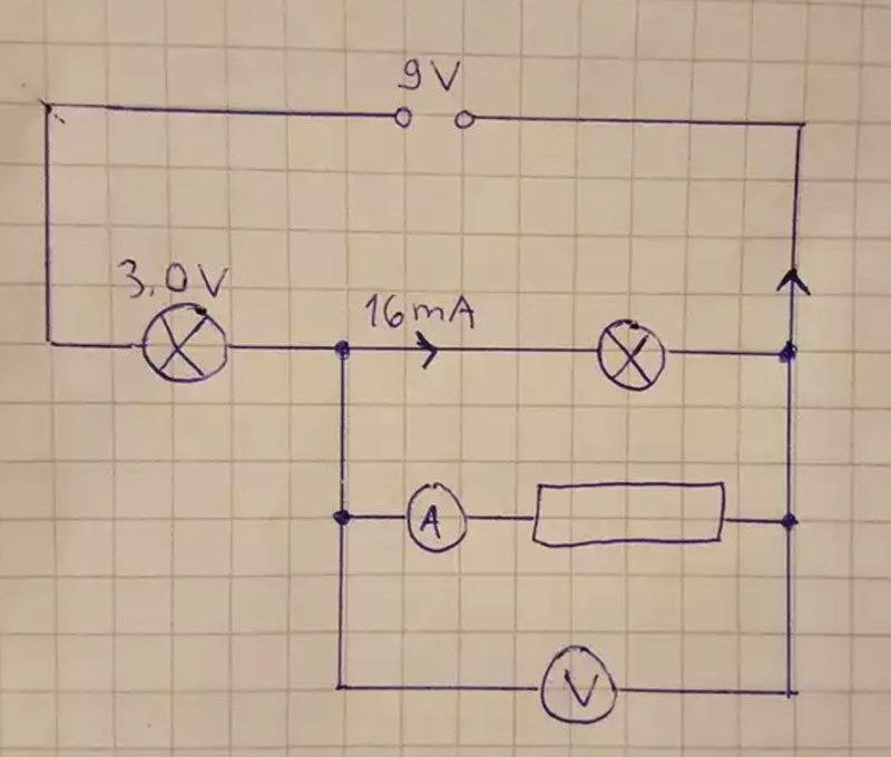 Se kopplingsschemat. Spänningen över den ena lampan är 3.0 V enligt figuren.