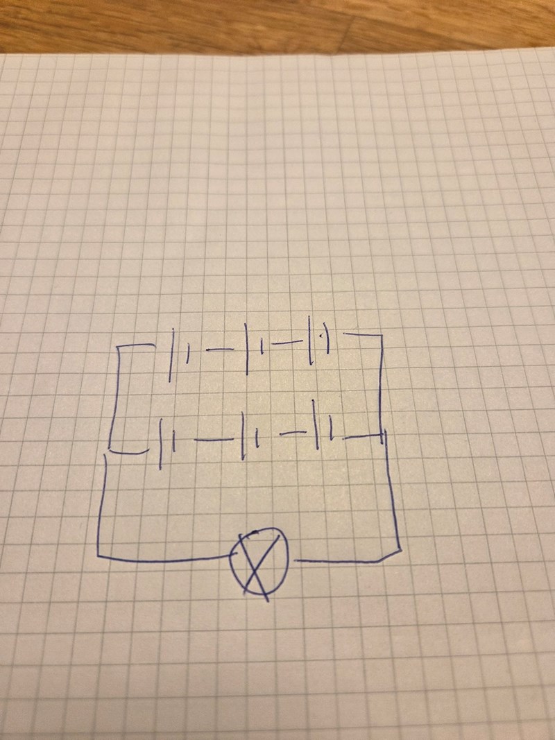 Vill bara höja ett litet varningens finger för att parallellkoppla batterier. Det gör man nästan aldrig i verkligheten.