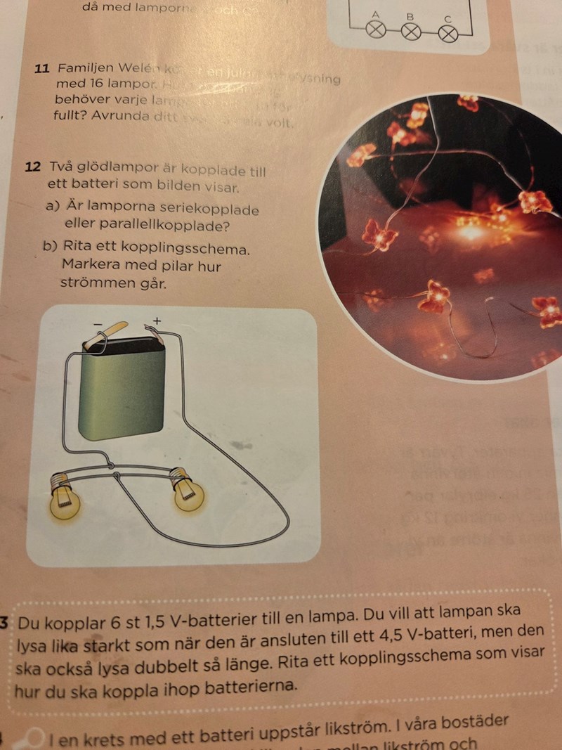 Fattar ej hur jag ska göra. Förstår att jag seriekopplar 3 batterier( då blir det 4,5v) men sen?Fråga13?