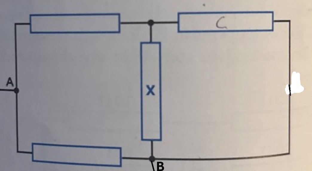 Punkten B är bara ett namn på en nod (position) i ett kopplingsschema. Eftersom en ledning i ett kopplingsschema bara är ett sätt att visualisera hur komponenter är sammankopplade elektriskt, så är högersidan av resistorn C och nedersidan av resistorn X elektriskt sett samma punkt. Dvs oavsett i vilken position du placerar punkten B längs ledningssegmentet vi pratar om så kommer potentialen och strömmen vara densamma i punkten.