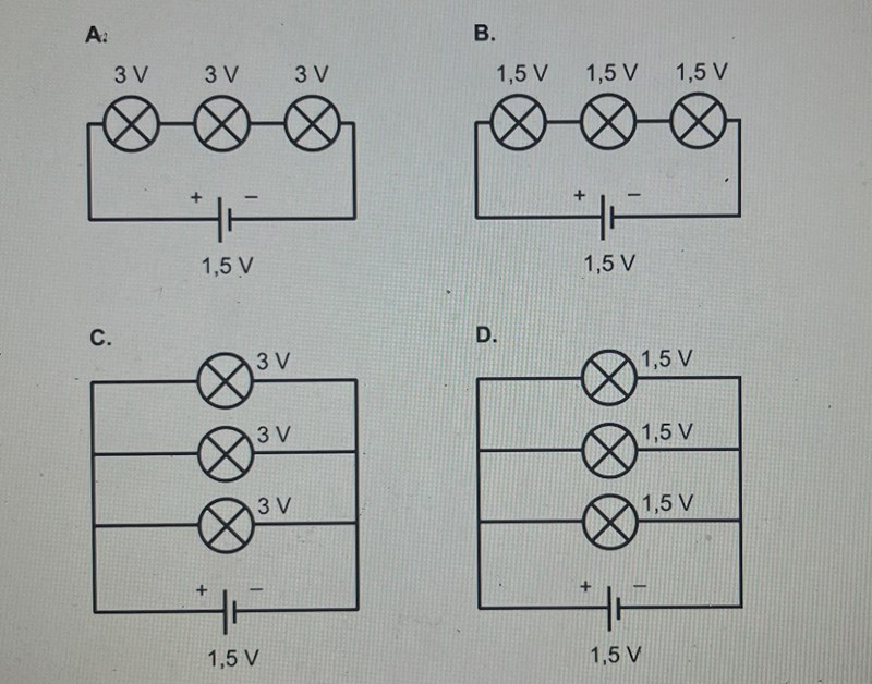 Enligt facit så är kopplingsschema D korrekt svar, men jag förstår inte varför. Jag förstår att man måste ta ett kopplingsschema som är parallellkopplat, men varför borde man ta det med 1,5 Volt istället för det med 3 Volt?