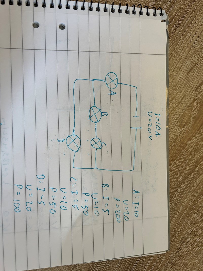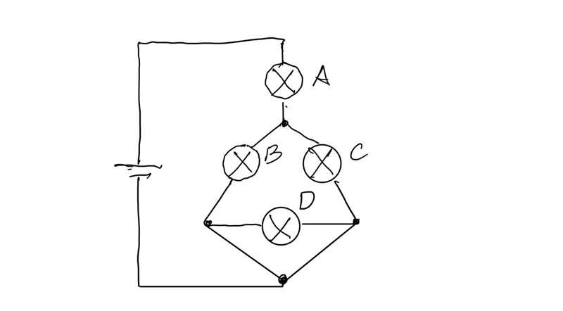 Rita ett kopplingsschema som uppfyller följande: Lampa A ska lysa starkast. Lampa B och C lyser lika starkt men svagare än A. Lampa D lyser svagast.