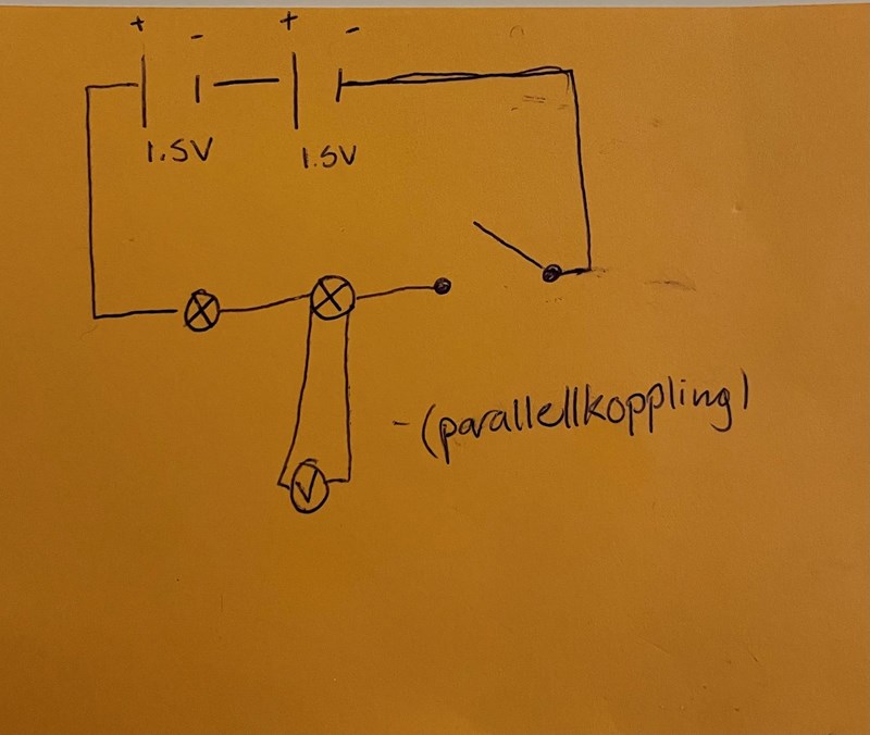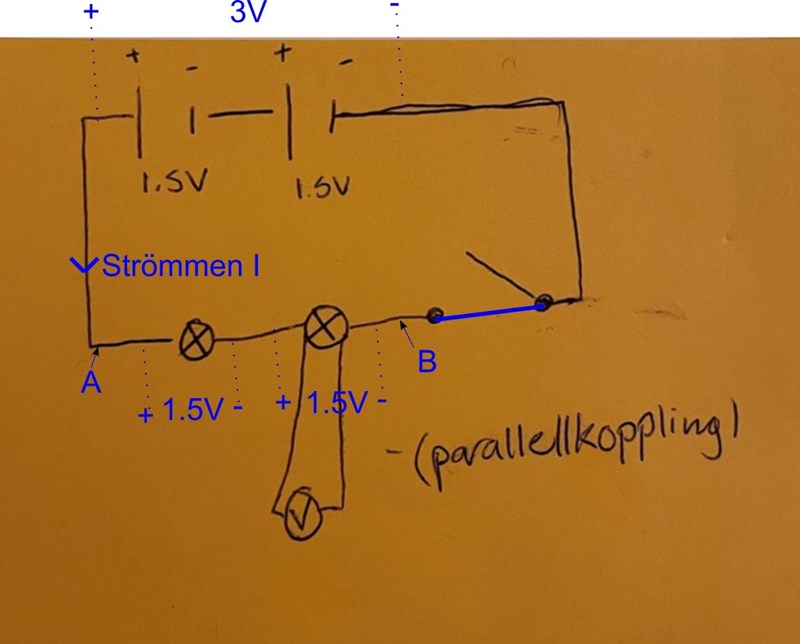 Vi fick i uppgift att ta reda på vad voltmetern skulle visa. Först tänkte jag att det borde vara 3 volt, eftersom batterierna är seriekopplade. När vi sedan testade kopplingen i verkligheten visade den 1,5 volt. Men om strömmen ”delar sig” precis innan den första glödlampan och voltmetern borde väl den första glödlampan också få 1,5 volt, och den andra glödlampan borde få 3 volt, eftersom strömmen enar sig efter glödlampan och voltmetern, vilket borde betyda att den andra lampan lyser starkare. Men det gjorde den inte. Jag förstår därför inte riktigt vad som hände, och varför det blev så. Skulle någon kunna förklara?😃