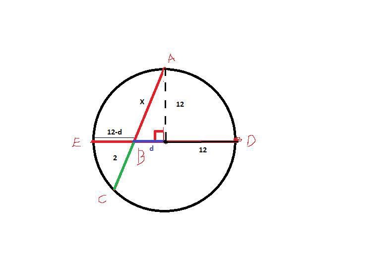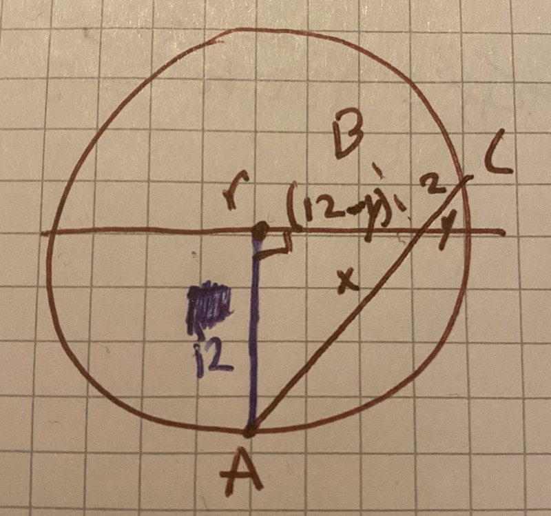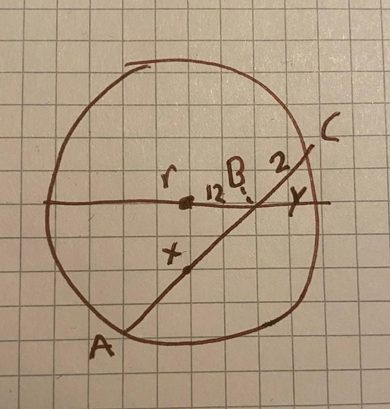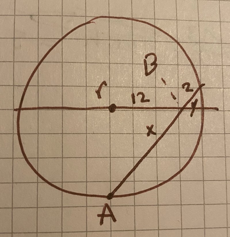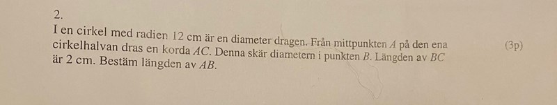Längden är givet som 2 cm samt att radien var 12 cm. Längden från punkten B till medelpunkten kallar jag d från detta erhålls följande uttryck, och .