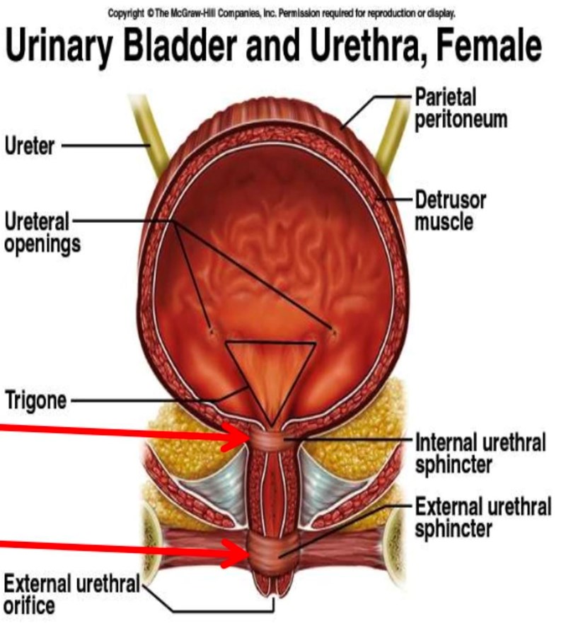 Den cirkulära slutarmusklern som genom det autonoma nervsystemet reglerar urinflödet ut ur urinblåsan, är pytteliten och finns i nederkanten av urinblåsan, i början av urinröret (övre röda pilen, internal urethral sphinkter).