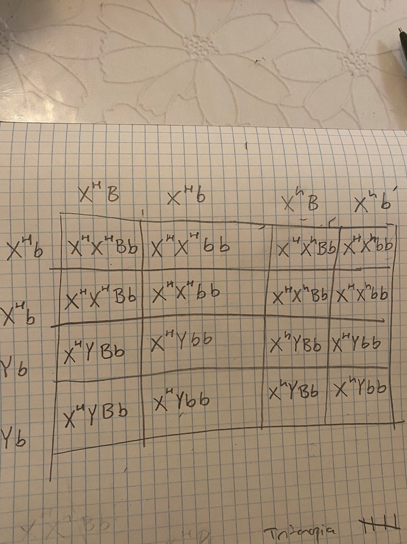 Tyckte detsamma. Och jag är väldigt förvirrad över varför läraren presenterade kvinnan som BbHh - då ser det väl ut som om H genen inte är på en X kromosom? Och hur hade jag presenterat mannen med det formatet? Då hade väl han varit bbH ? Men ser inte rätt ut