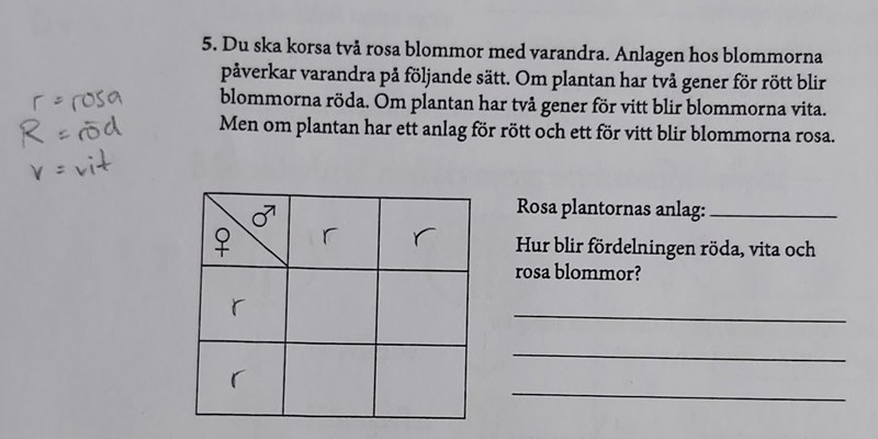 Hej, jag vet inte hur man ska börja med denna uppgift. I början av uppgiften står det "korsa två rosa blommor med varandra" och därför skrev r i schemat. Men vet ej hur ska jag forsätta.