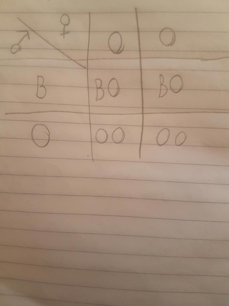 Rita korsningsschema för en kvinna med blodgrupp 0 som får barn med en man med blodgrupp B. Finns det några alternativ eller blir ditt/dina korsningsscheman 100% säkra?