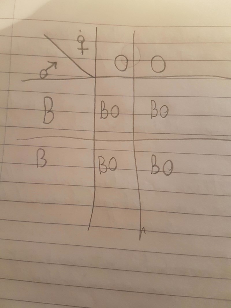 Kvinnan måste ju ha anlagen 00, men måste mannen ha anlagen BB? Kan det inte också vara B0? Vad händer då med korsningsschemat?