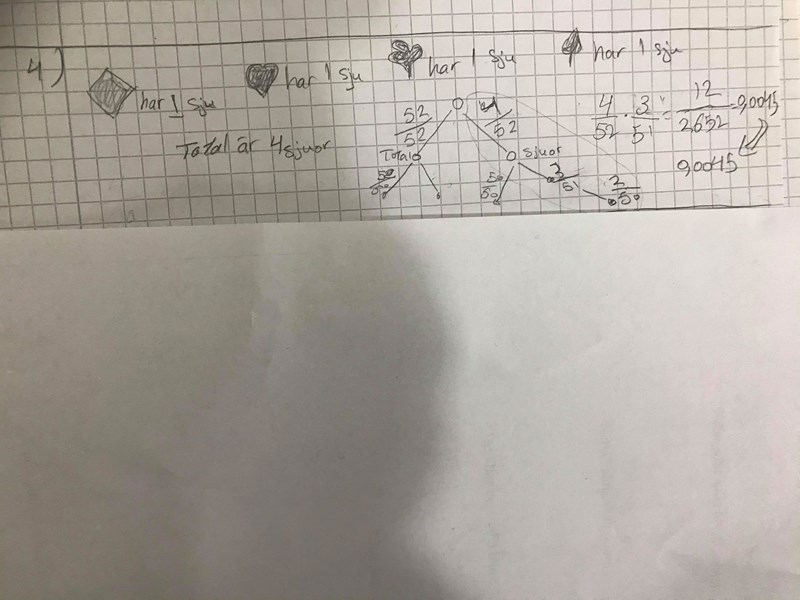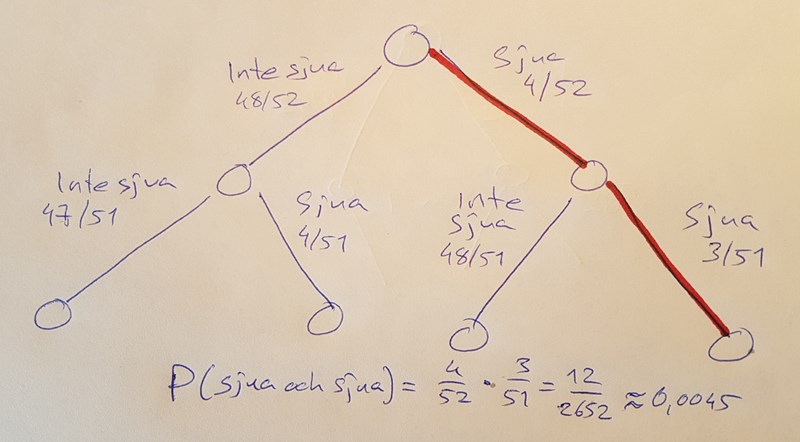 Är träddiagramet från totala kortet rät också? eftersom 4 sjour är en del av 52 om man räknar sjour det betyder att 52 minskar till 48/52?