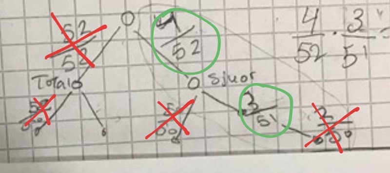 Varför skriver du ut en tredje nivå i trädet? Den behövs inte eftersom du endast ska dra två kort, dvs eftersom det endast är två händelser som ska beskrivas. Så har du även gjort i tidigare trådar.