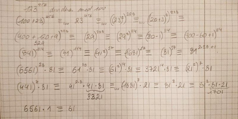 Jag tänkte på Lilla Fermats sats men det ger mig slut resultat 23, som är fel. Det betyder att det är nog något som jag missupfattade med denna sats....