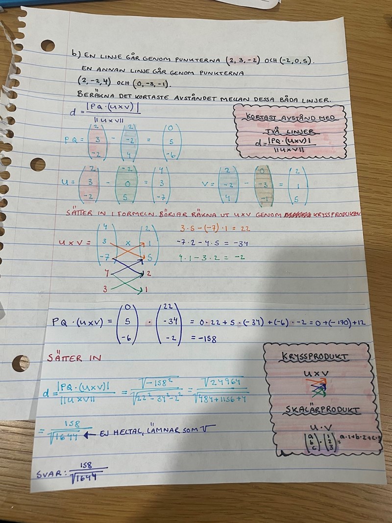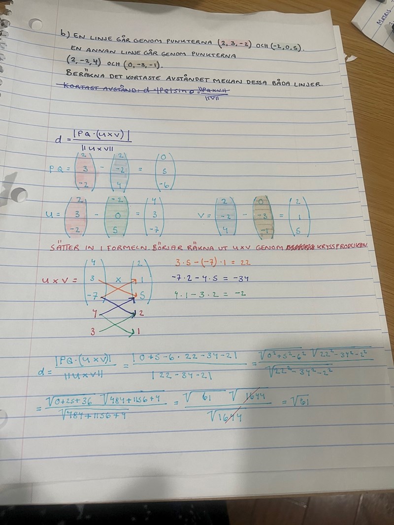 Där u och v är riktningsvektorer för de två linjer som vardera håller punkterna och . Men du har ingen nytta av en färdig formel om du inte förstår den.