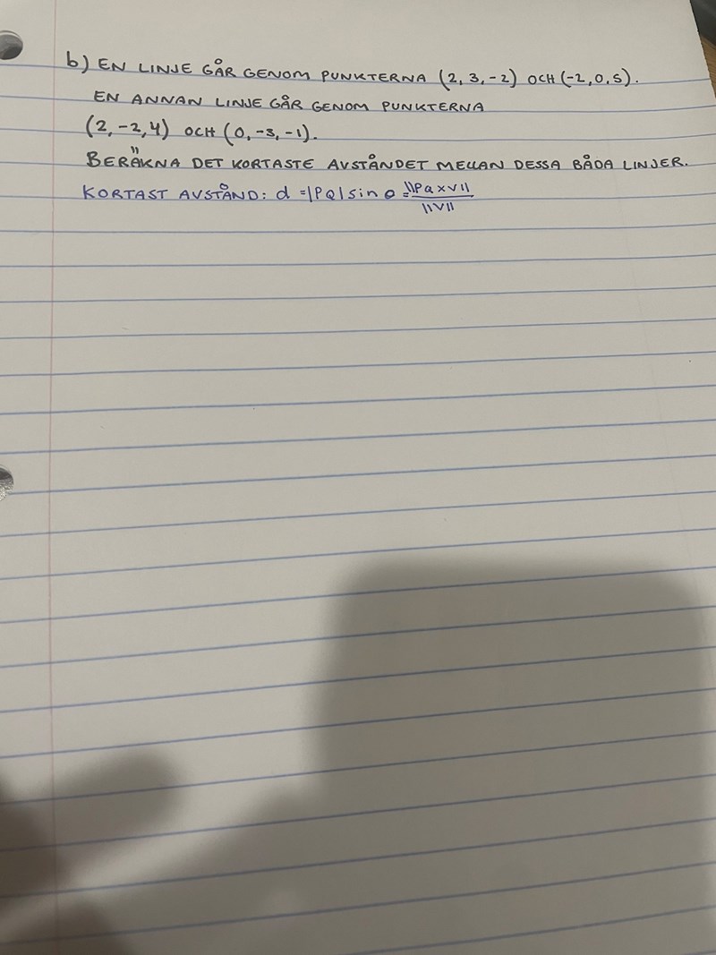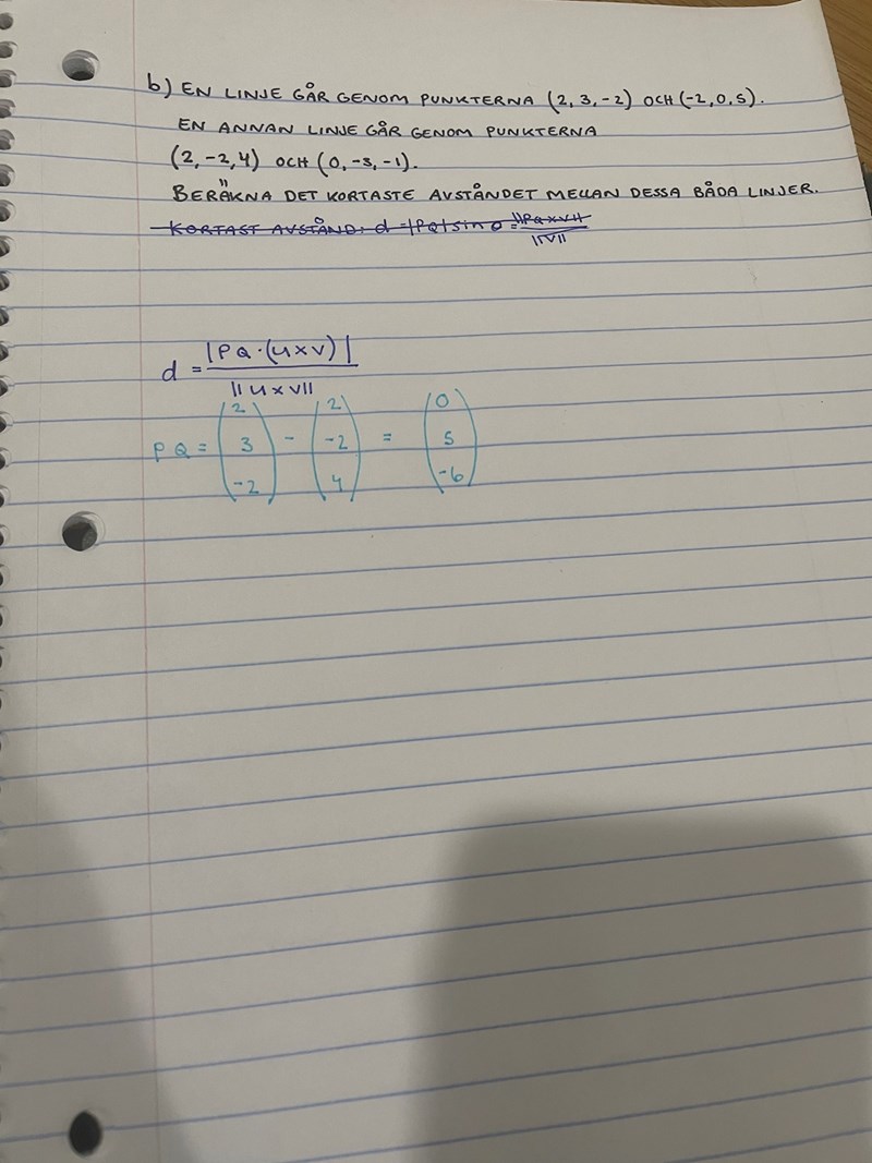 Jag förstår inte riktigt hur jag ska göra här. Är de 2 olika jag ska räkna ut genom denna formeln? Och q= (2,3,-2) på första linjen och q2=(-2,0,5)?