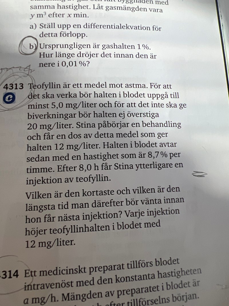 Hon får som längst vänta till dess halten är 5, dvs a*0,913x = 5 ger längsta väntetid x.
