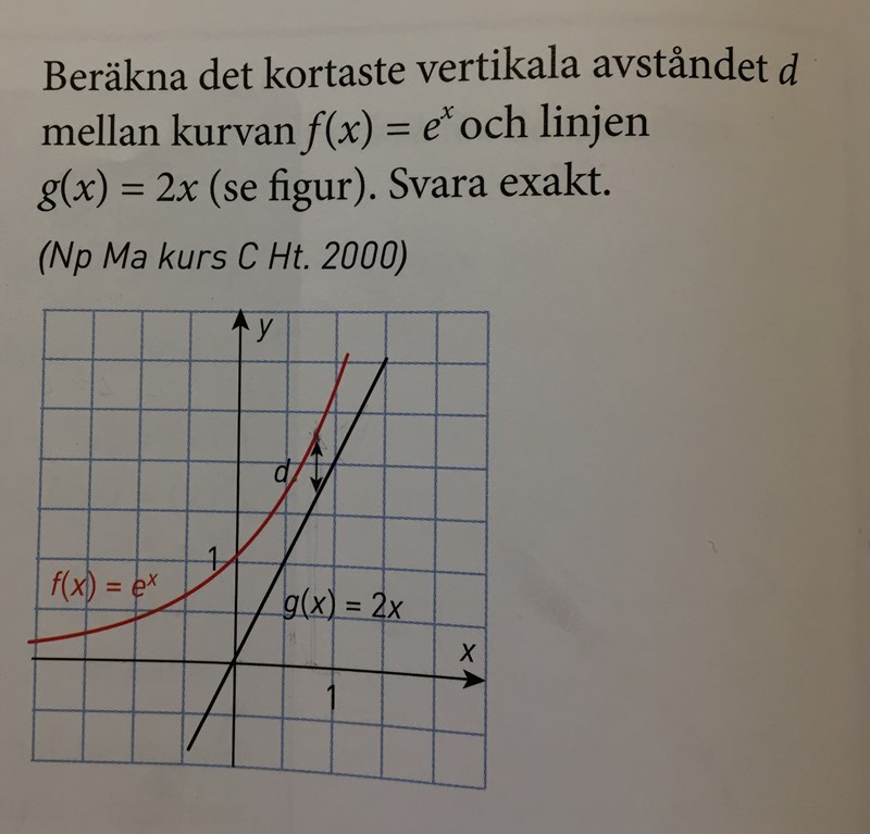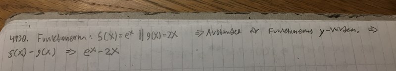 Det jag inte förstår är varför vi ska ta derivatan av e^x-2x och sedan sätta det =0 för att få fram x-värdet?