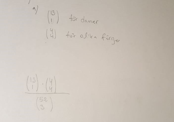 alexander19961 skrev:Det finns 4 damar av kortlek och då måste väl vara (13 över 1) gånger (4 över 4) för färger sen delat på (52/2). så tänker jag