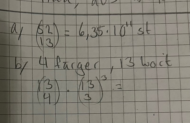 Aha okej, alltså har jag missat att räkna ut hur man kan välja ut 4 färger på? Som ska ha 4 kort var?