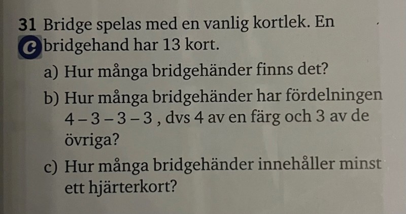 Men samtliga 4 färger kan vara den färgen du valde 4 kort från, därmed måste du multiplicera med 4. (Notera att det inte spelar någon roll i vilken ordning färgerna med 3 kort är i, eftersom att detta inte påverkar antalet kombinationer).