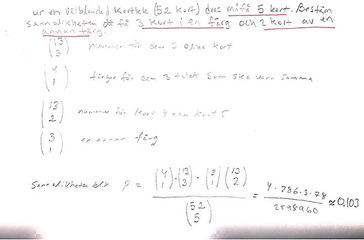 Hej allihopa! jag har en kortlek där dras måfå 5 kort och jag har beräknat sannolikheten att få 3 kort i en färg och 2 kort av en annan färg. Färgerna i en kortlek är spader, hjärter, ruter och klöver.