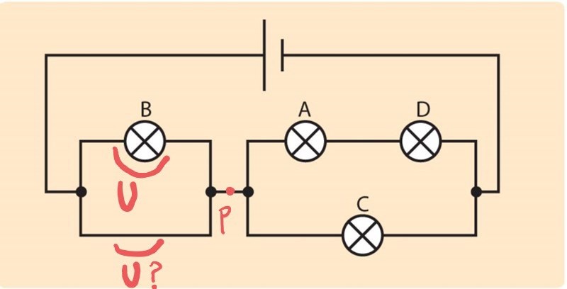 Men det är en sak jag inte förstår – jag ser faktiskt inget skäl till att strömmen inte skulle passera B. Varför skulle den inte kunna passera B? Att spänningsfallet blir 0 är en annan femma. Kan inte strömmen bara passera lampan utan att förlora potential? Precis som strömmen kommer passera i resten av ledaren – utan att förlora potential.