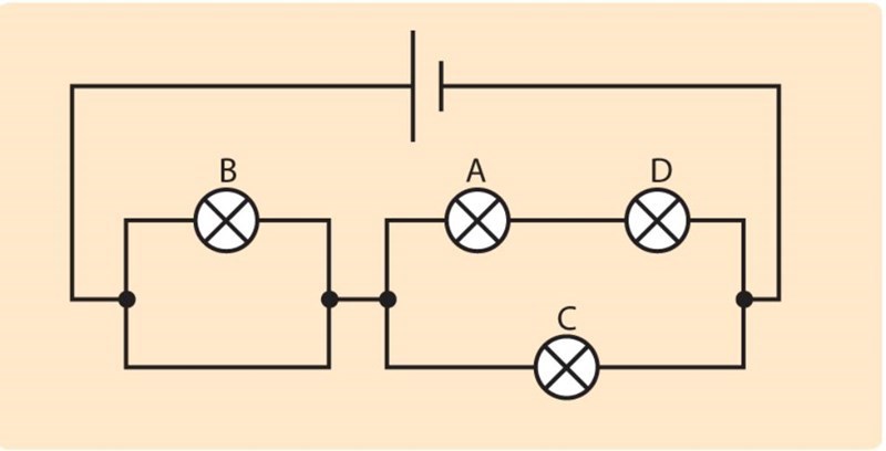 Om strömmen går genom B innebär att du tappar potential eftersom lampan då skulle lysa. Strömmen väljer lättaste vägen och det är via kortslutningsslingan. Den andra vägen är uppförsbacke.