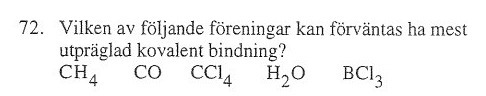 Frågan kan formuleras om till "För vilken av de fem molekylerna är skillnaden i elektronegativitet mellan de båda atomslagen minst?" - men det är meningen att du själv skall inse detta!