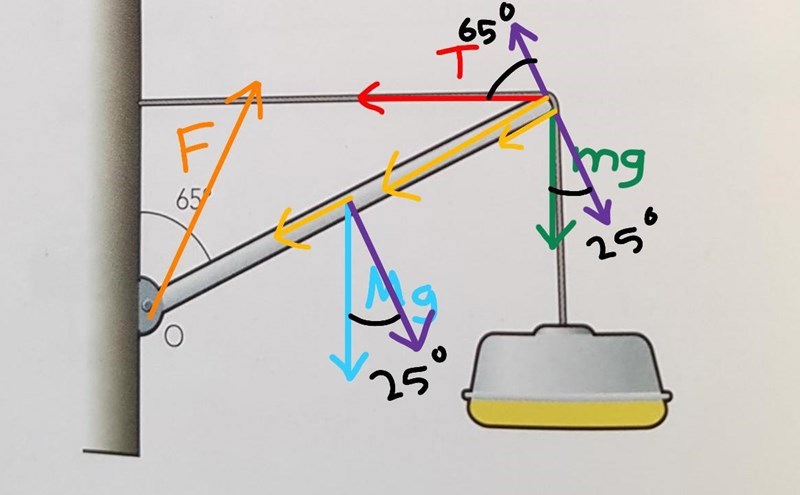 Hej!avgående kraftmoment. Jag undrar vad är det orange F för något varför behöver man ha den för att räkna ut spänningskraften i wiren? kan någon förklara snälla.