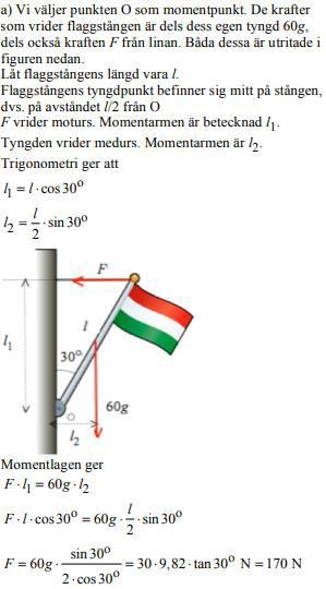 Den andra varianten, som de använder i exemplet, är att man tittar på hävarmens längd vinkelrätt mot den kraft som ger momentet. I detta fall får alltså F en hävarm på l*cos (30) och massan en hävarm på l/2*sin(30)