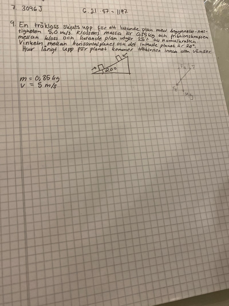 Räkna först ut Fres som verkar på klossen nedför planet, med Newtons andra lag kan du då räkna ut decelerationen. Med den kan du sen bestämma sträckan då hastigheten är noll.