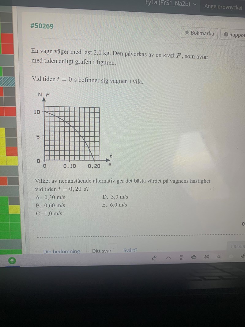 Vi har vikten på en vagn som 2 kg och den påverkas av en kraft som avtar med tiden. Bilden klistras inte in men det är ett diagram där y-axeln är newton och är upp till 10 och x-axeln är sekunder och är 0,2 sekunder. Hur kan man räkna ut hastighet när den är 0,2s?
