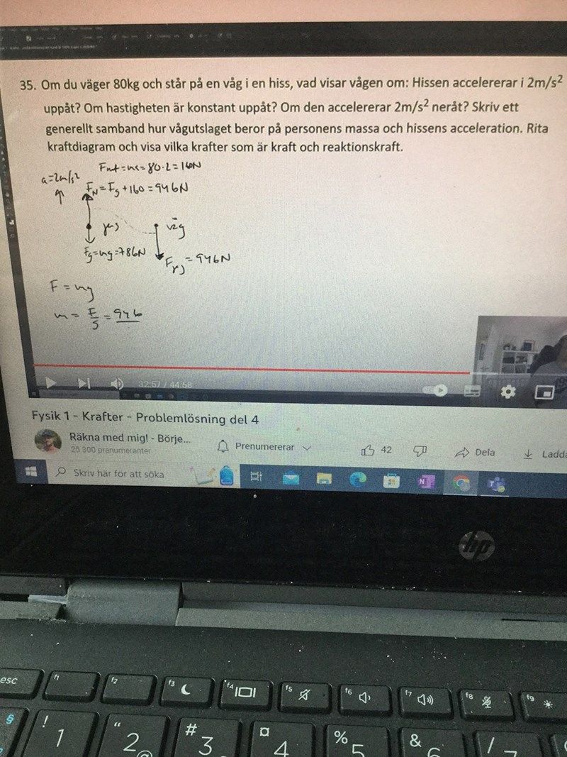 Borde inte Fg som är 786N också trycka mot vågen. Men enligt uträkningen i videon är det bara normalkraftens reaktionskraft som trycker på vågen och ger utslag. Kan någon förklara? Är det kanske så att tyngdkraften är inbakad i reaktionskraften?