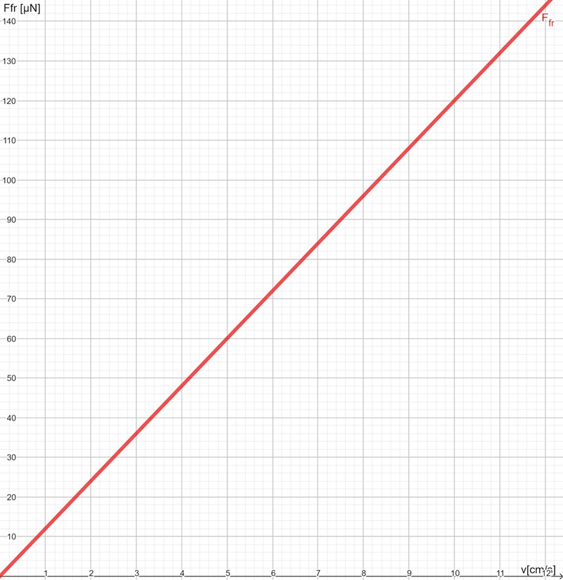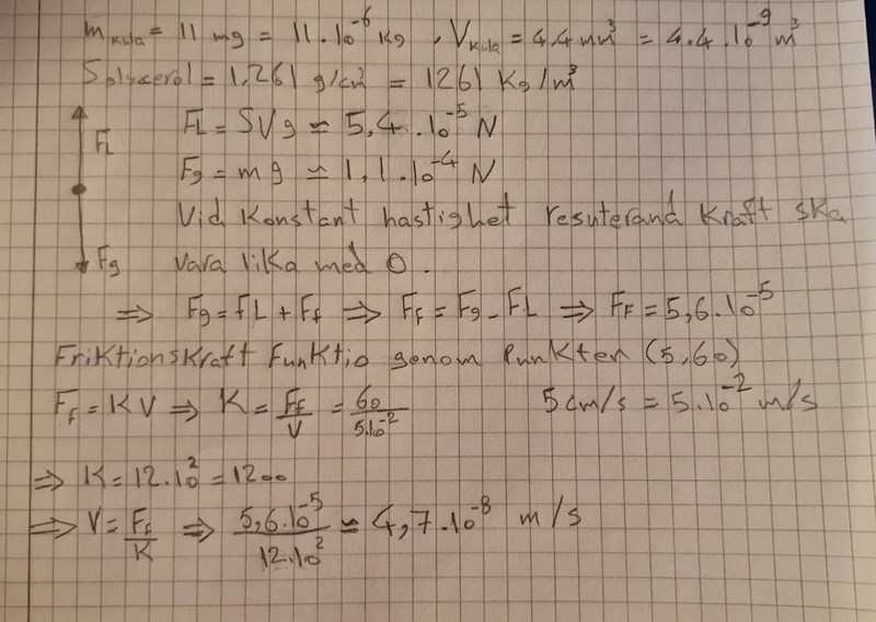 Frågan : Vid ett experiment släpps en kula med massa 11,0mg och volym 4,4mm^3, i ett smalt rör fyllt med glycerolsom har densiteten 1,261g/cm^3. Friktionskraften som glycerolen utövar på kulan är proportionell mot kulanshastighet, och kan ses i diagrammet. Efter en stund kommer kulan röra sig med kontant hastighet v, bestämdenna hastighet.