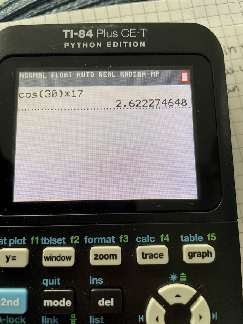 Enligt min fysiklärare så ska 17*cos (30) bli 14,7