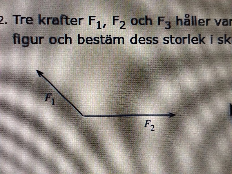Tre krafter F1, F2 och F3 håller varandra i jämvikt. De två första krafterna är ritade i figuren, Rita in kraften F3 i samma figur och bestäm dess storlek i skala.
