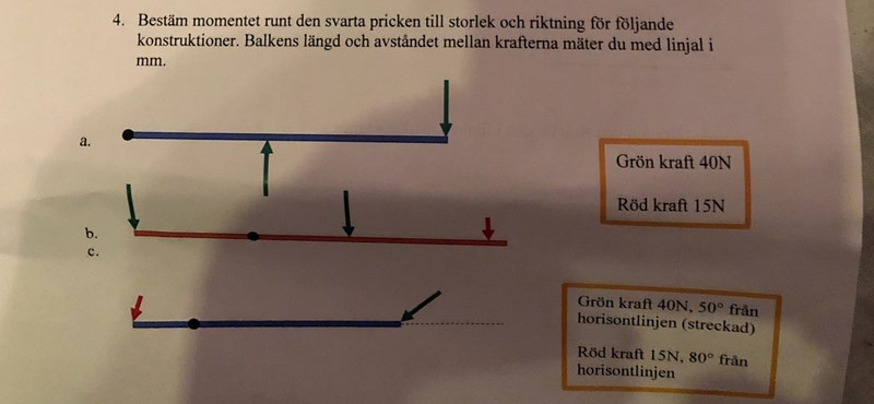 - Balkens längd är 66 mm. - Avståndet mellan den röda kraften och den svarta pricken är 15 mm. - Avståndet mellan svarta pricken och den gröna kraften är 51 mm