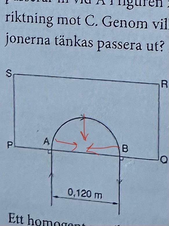 Visa med kraftpilar hur kraften måste vara riktad för att elektronerna ska kunna färdas i den vana som figuren visar.