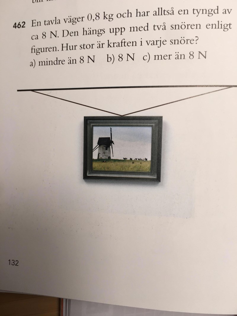 Hej! jag har en undran. Jag anser nämligen att kraften i varje snöre är mindre än 8N eftersom de utgår från samma punkt och därmed delar på kraften...I facit står det att kraften i varje snöre är större än 8N. Beror det på att snörena är fästa i två olika punkter som har varsin spännkraft och normalkraft? Jag behöver bara få det förklarat så förstår jag nog snabbt