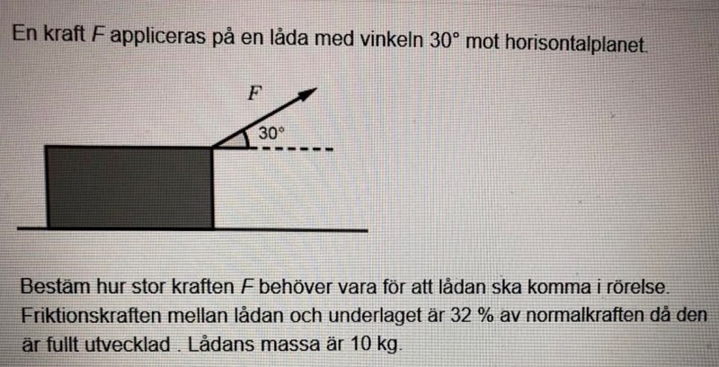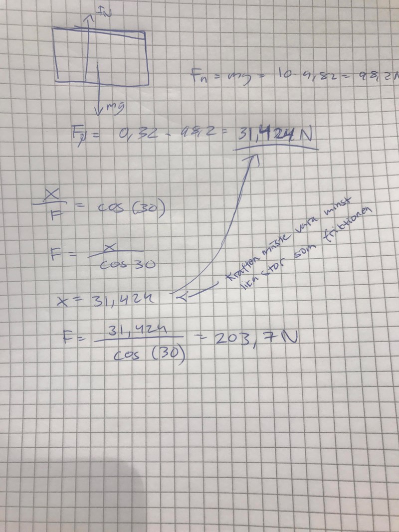 Smillasmatematikresa skrev:PATENTERAMERA skrev:Verkar inte 203 N vara lite i saftigaste laget, när friktionen bara är 31 N? Har du rätt värde på cos(30˚)?