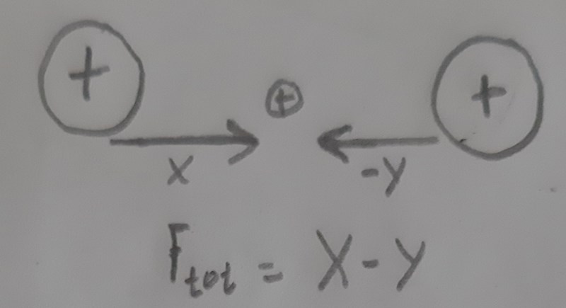 Om vi däremot har två positivaladdningar som verkar på en testladdning så tar ju de ut varandra, dvs totalla kraften blir skillnaden mellan dem?