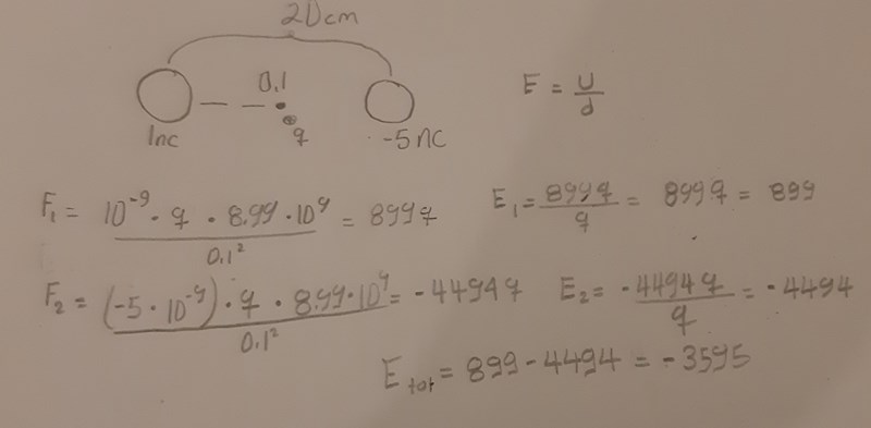 Du har skrivit i uppgiften att laddningarna är +1,0 nC och -50 nC, men sedan har du räknat med att den negativa laddningen är -5 nC, vilket skall det vara?
