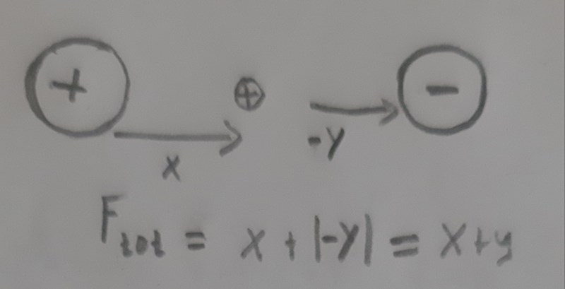 Jag har nu fattat vad du menar , men kraften är på F1= positivt och F2= negativt. Om kraften verkar åt samma riktning som jag har ritat i bilden borde de inte då antingen vara negativa eller positiva. Är inte kraft en vektor, vilket betyder att man inte kan bara så där ändra dess riktning?