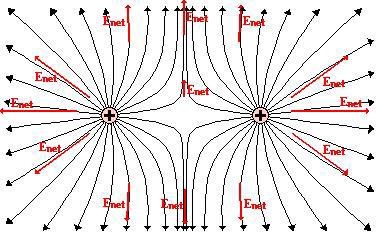 Jag försökte hitta en bra bild som visar detaljer i E-fältet precis mitt emellan laddningarna. Det som händer ju närmare mitten man kommer är att fältlinjerna bryter av, antingen uppåt eller nedåt. Precis i mitten kommer det att vara "stiltje".