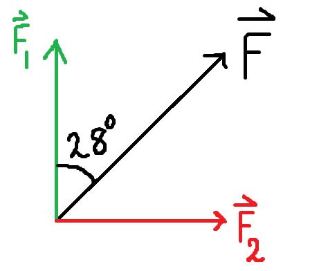 I skissen ser F1 och F2 ut att vara lika stora, men det behöver de ju inte vara. Det ser också ut som om den markerade vinkeln är 45 grader, men den är ju 28 grader.