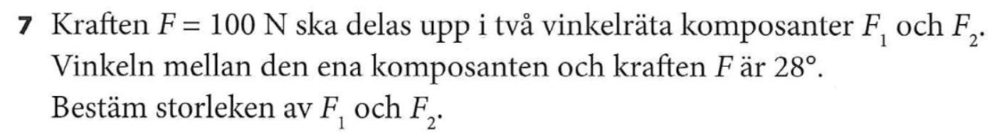 • cos(28°) = F2/100, dvs att F2 = 100•cos(28°) \approx 88 N.